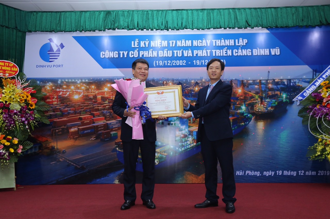 Trong khuôn khổ Lễ kỷ niệm 17 năm ngày thành lập Cảng Đình Vũ, Tổng giám đốc Cao Văn Tĩnh đã được trao tặng Bằng khen của Tổng Công ty Hàng hải Việt Nam vì thành tích xuất sắc trong công tác điều hành năm 2019. Tham dự buổi lễ, Ông Phạm Hồng Minh – Phó bí thư Đảng ủy, Chủ tịch Hội đồng quản trị Công ty Cổ phần Cảng Hải Phòng đã trao Quyết định khen thưởng và Bằng khen cho Tổng giám đốc Cao Văn Tĩnh. Nhân dịp đặc biệt này, Ban lãnh đạo Cảng Hải Phòng cũng đã trao hoa và quà lưu niệm cho Ban lãnh đạo Cảng Đình Vũ.