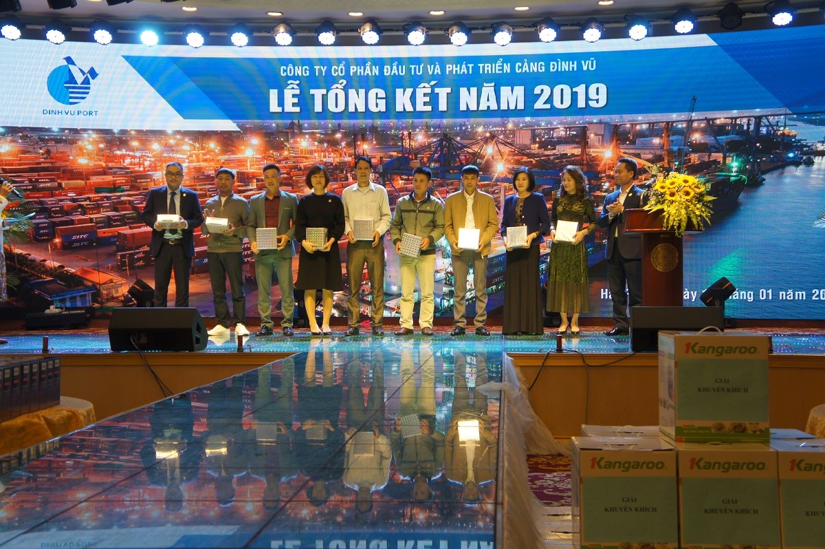Trong khuôn khổ Lễ tổng kết và liên hoan tất niên 2019, có 03 tập thể (Phòng Điều độ khai thác, Tổ sửa chữa - Đội cơ giới, Tổ điện trạm - Phòng Kỹ thuật) cùng 09 cá nhân tiêu biểu các phòng ban đã được Ban lãnh đạo Công ty biểu dương khen thưởng cho thành tích xuất sắc trong năm đóng góp vào thành công chung của Cảng Đình Vũ.