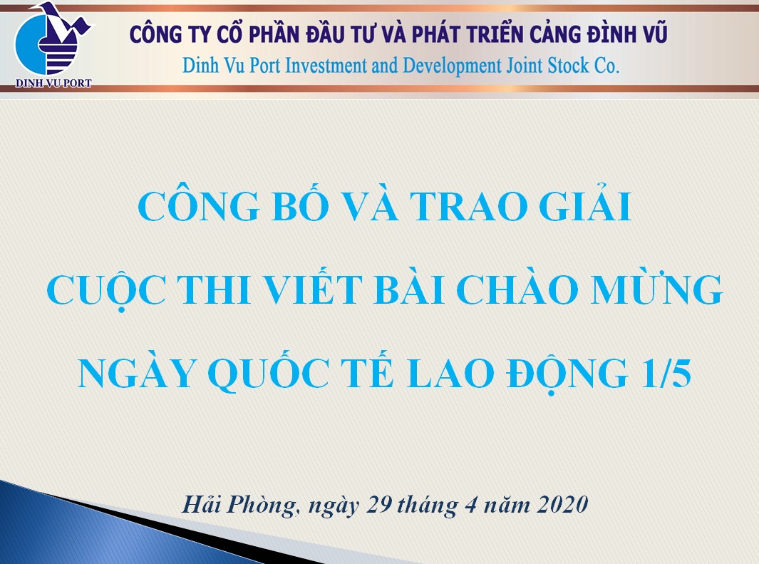 Ngày 20 tháng 4 năm 2020, Cảng Đình Vũ ban hành Quyết định số 100/2020/QĐ-TCTL về việc tổ chức “Cuộc thi viết bài chào mừng Quốc tế lao động 1/5”. Sáng ngày 29 tháng 4, Ban tổ chức công bố kết quả và tiến hành trao giải cho các tập thể và cá nhân tham gia viết bài dự thi.