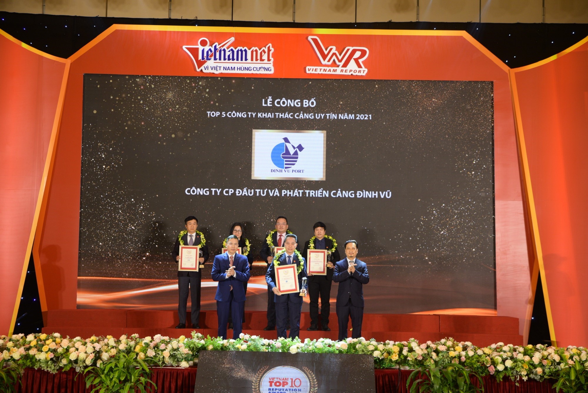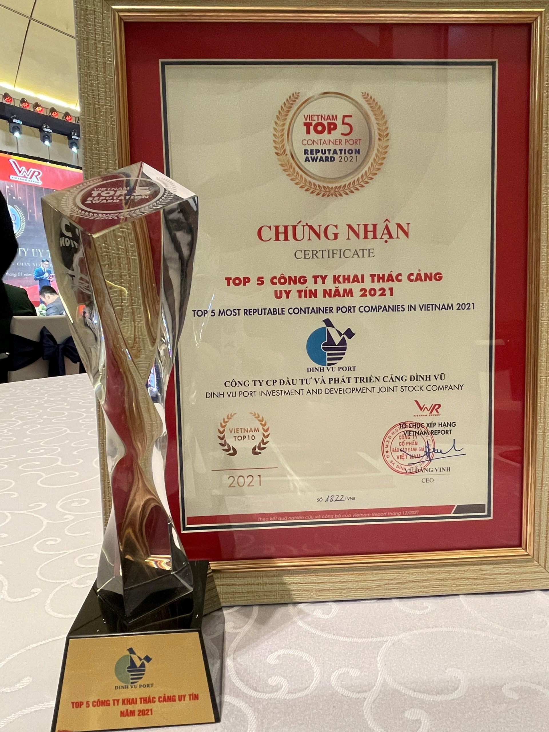 Ngày 14/01/2022 tại Trung tâm Hội nghị Quốc gia Việt Nam, TP. Hà Nội, Công ty cổ phần Báo cáo Đánh giá Việt Nam (Vietnam Report) phối hợp cùng Báo VietNamNet – Bộ Thông tin và Truyền thông chính thức tổ chức Lễ công bố Top 500 Doanh nghiệp lớn nhất Việt Nam & Top 10 Công ty uy tín các ngành nghề lĩnh vực. Với thành tích xuất sắc về sản lượng, doanh thu, lợi nhuận Công ty cổ phần Đầu tư và Phát triển Cảng Đinh Vũ vinh dự được trao Cup và Chứng nhận Top 5 Công ty khai thác cảng uy tín năm 2021.