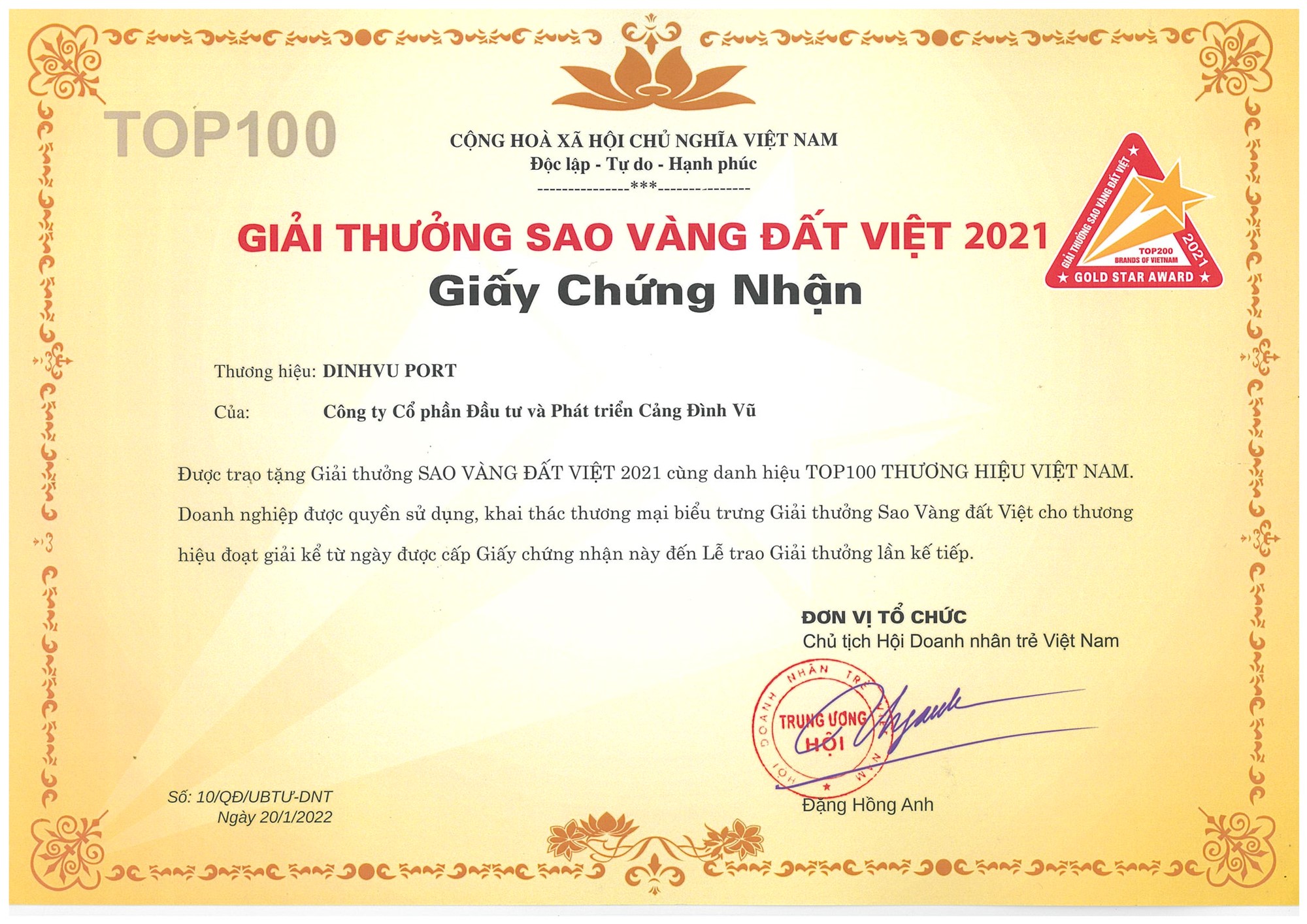 Ngày 30/03/2022, tại Trung tâm Hội nghị Quốc gia Việt Nam, Trung ương Hội Doanh nhân trẻ Việt Nam tổ chức Lễ trao Giải thưởng Sao Vàng Đất Việt 2021 để tôn vinh TOP10/TOP100/TOP200 Thương hiệu tiêu biểu Việt Nam. Cảng Đình Vũ lần thứ tư liên tiếp được vinh danh Top 100 trong Lễ trao giải.