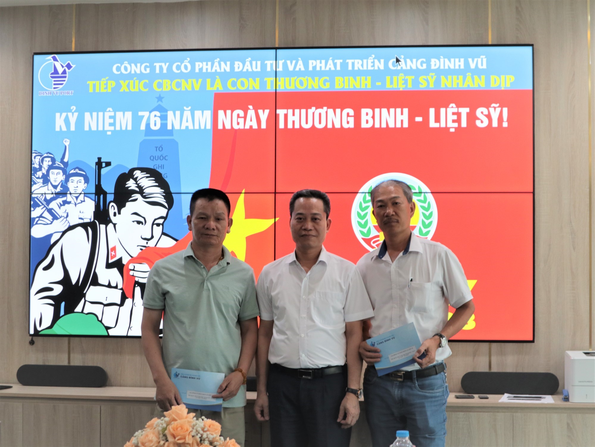 Sáng ngày 27/7/2023, Cảng Đình Vũ tổ chức tiếp xúc tri ân CBCNV là con thương binh - liệt sĩ nhân dịp kỷ niệm 76 năm ngày Thương binh-Liệt sĩ Việt Nam (27/7/1947-27/7/2023). Các thành viên ban lãnh đạo Công ty, đại diện BCH Đảng ủy, Chủ tịch Công đoàn, Chủ tịch Hội Cựu chiến binh Công ty cùng tham dự tặng quà.