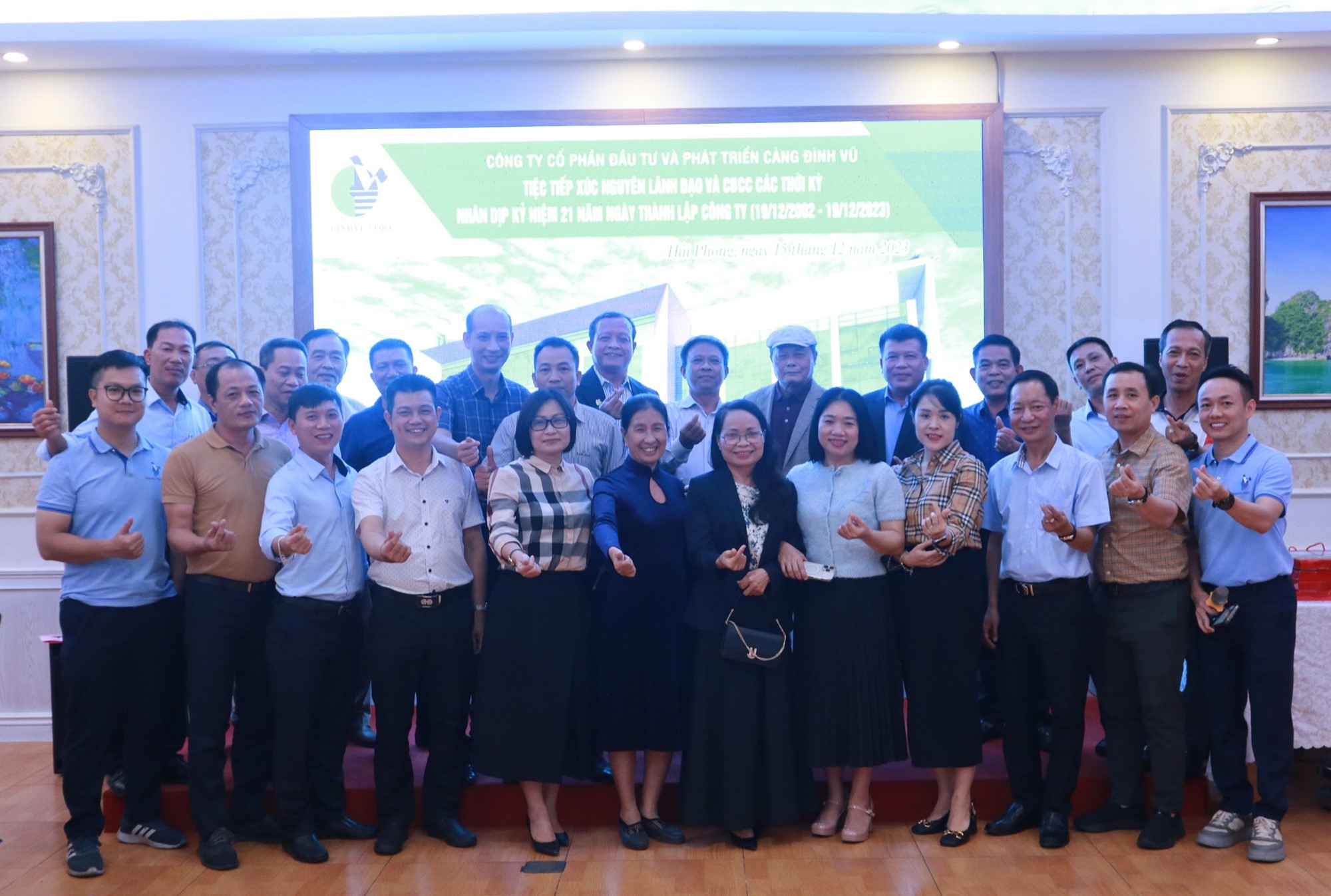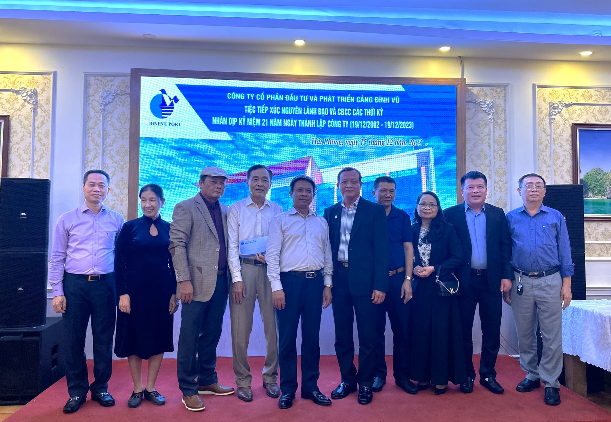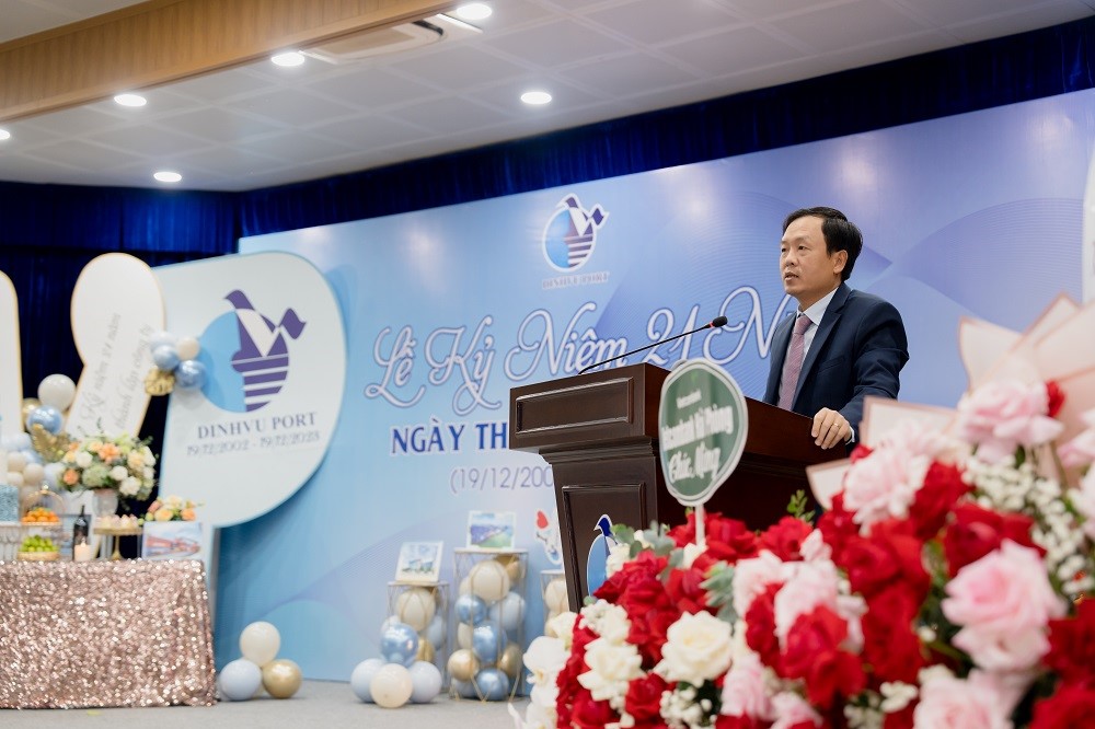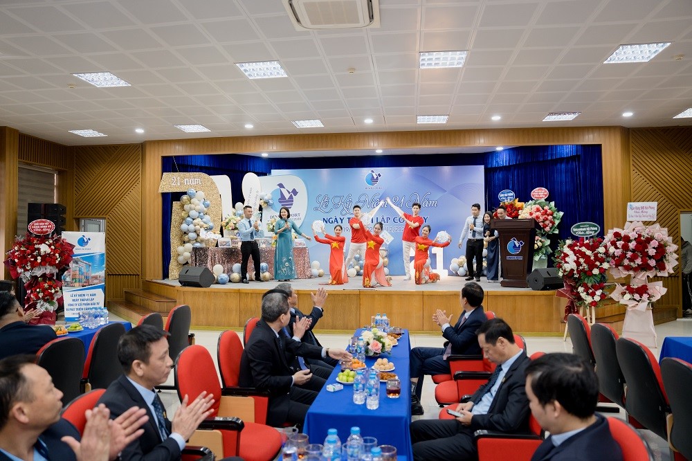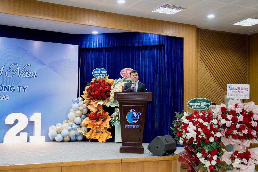 Sáng ngày 19/12/2023 Cảng Đình Vũ long trọng tổ chức Lễ kỷ niệm 21 năm ngày thành lập tại Hội trường Công ty với sự tham dự của các thành viên Hội đồng quản trị, Ban kiểm soát, Ban điều hành Công ty cùng hơn 150 cán bộ chủ chốt và nhân viên tiêu biểu đại diện cho các đơn vị phòng ban trong toàn Công ty. Đại diện lãnh đạo Cảng Hải Phòng: Ông Phạm Hồng Minh – Chủ tịch HĐQT Công ty và Ông Chu Minh Hoàng – Phó TGĐ Công ty cũng đã đến tham dự sự kiện, gửi lời chúc mừng và tặng quà tới tập thể lãnh đạo và CBCNV Cảng Đình Vũ.