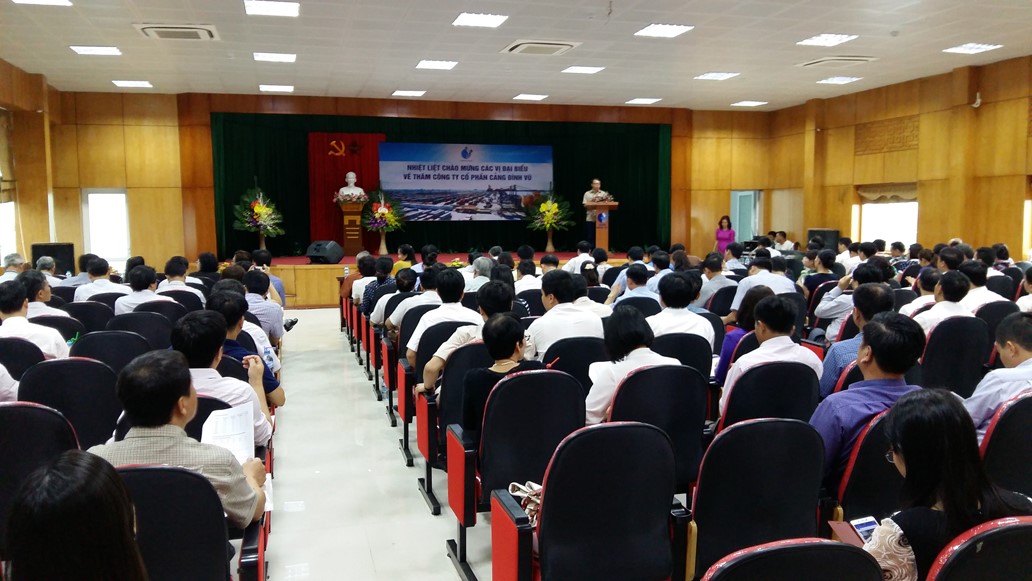 Đại diện lãnh đạo cảng Đình Vũ báo cáo với đoàn về quá trình hình thành và phát triển của Cảng Đình Vũ trong 14 năm qua. Qua báo cáo, các đại biểu rất ấn tượng với kết quả kinh doanh cũng như các thành tích đạt được của Cảng Đình Vũ trong những năm qua.