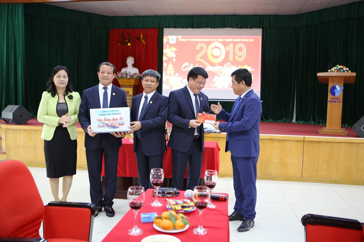 Tại Hội nghị, ban lãnh đạo Cảng Đình Vũ đã gửi lời chúc mừng năm mới cùng những món quà lì xì tài lộc tới toàn thể cán bộ nhân viên toàn Công ty. Ban lãnh đạo Công ty Cổ phần Cảng Hải Phòng cũng đã đến tham dự và trao tặng món quà chúc mừng năm mới tới Ban điều hành Cảng Đình Vũ.