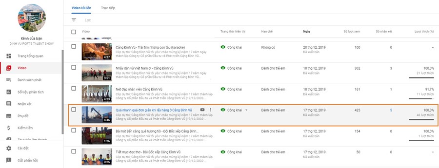 Ban tổ chức Cuộc thi clip “Cảng Đình Vũ tôi yêu” chào mừng kỷ niệm 17 năm thành lập Cảng Đình Vũ xin thông báo, tính đến 15h00 ngày 23/12/2019 (Thứ 2), tổng số lượt xem và yêu thích các clip như sau (theo thứ tự từ cao xuống thấp):