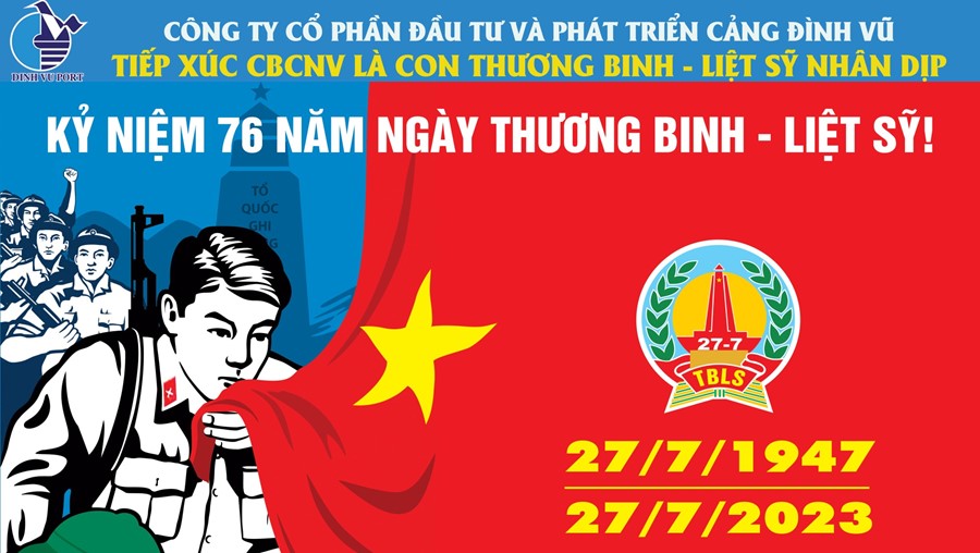 Sáng ngày 27/7/2023, Cảng Đình Vũ tổ chức tiếp xúc tri ân CBCNV là con thương binh - liệt sĩ nhân dịp kỷ niệm 76 năm ngày Thương binh-Liệt sĩ Việt Nam (27/7/1947-27/7/2023). Các thành viên ban lãnh đạo Công ty, đại diện BCH Đảng ủy, Chủ tịch Công đoàn, Chủ tịch Hội Cựu chiến binh Công ty cùng tham dự tặng quà.