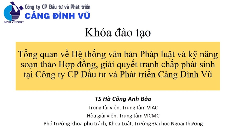 Trong 2 ngày 06-07/4/2023 Cảng Đình Vũ đã tổ chức chương trình đào tạo “Tổng quan về hệ thống văn bản pháp luật; Một số Luật, Nghị định, Thông tư liên quan đến hoạt động sản xuất kinh doanh trong doanh nghiệp cảng biển; Kỹ năng đàm phán, soạn thảo hợp đồng, giải quyết tranh chấp phát sinh” tại Hội trường Công ty.