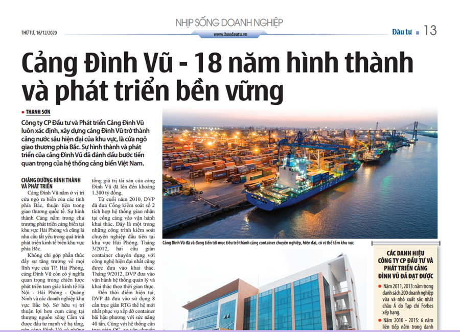 Nhân dịp Công ty Cổ phần Đầu tư và Phát triển Cảng Đình Vũ chào đón Lễ kỷ niệm 18 năm ngày thành lập (19/12/2002-19/12/2020), Báo Đầu tư và Đầu tư Online đã dành riêng một trang báo viết về Cảng Đình Vũ. Nội dung bài báo của tác giả Thanh Sơn được trích toàn văn nội dung báo giấy cùng đường link online.