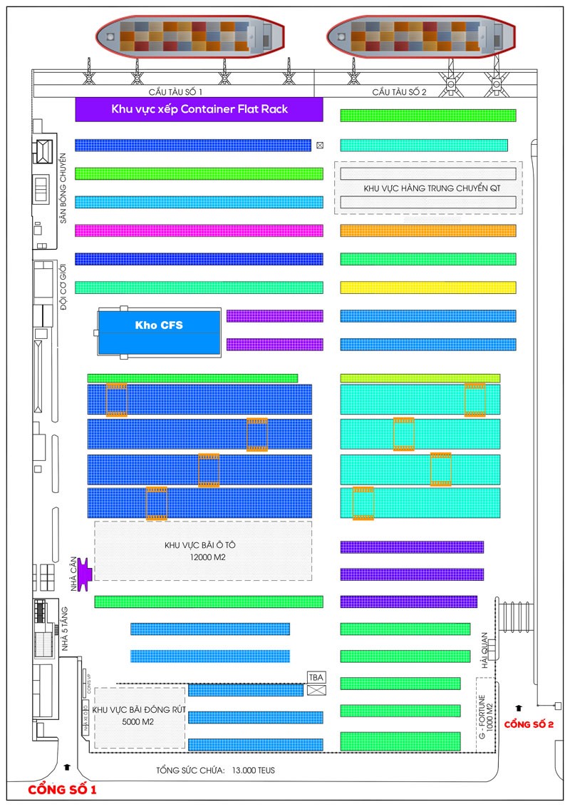 - 02 Cần trục giàn STS (Ship-to-shore): sức nâng 50 tấn, tầm với phía sông: 35m.